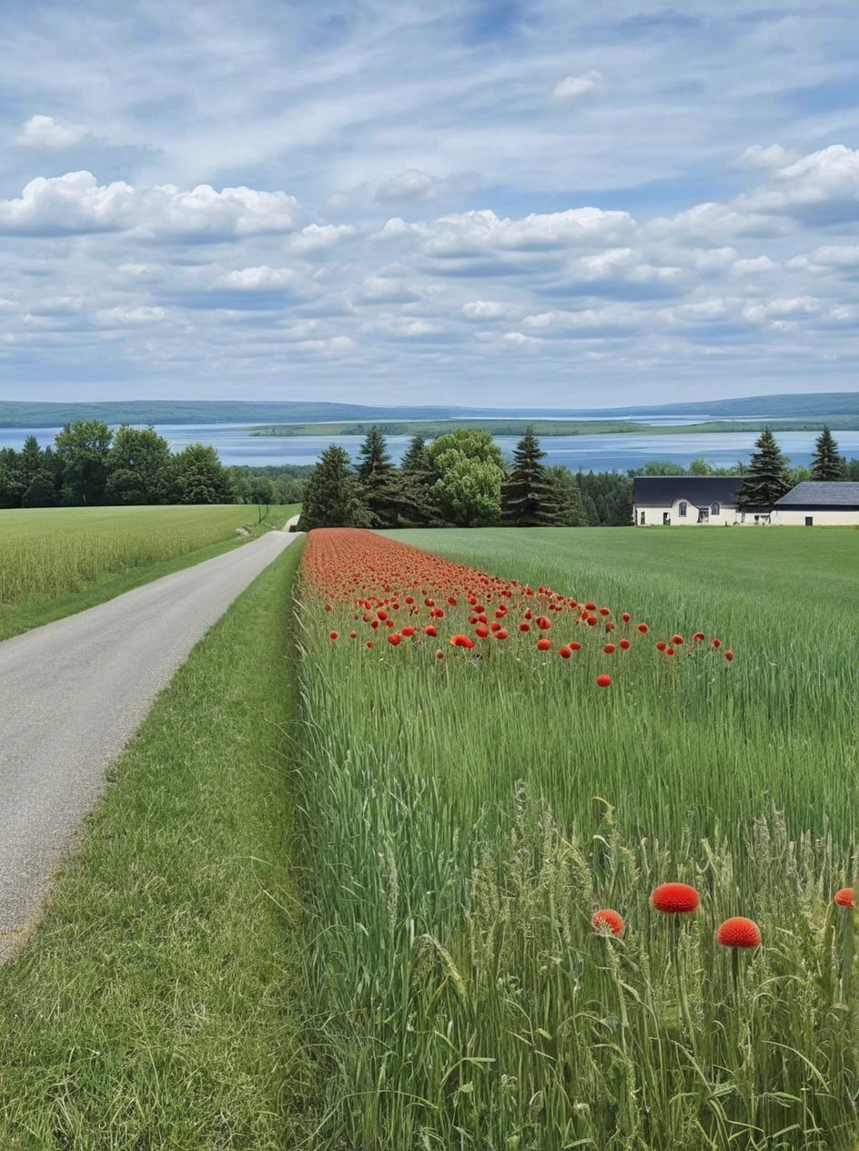 A vibrant landscape in summertime features rolling green hills, dotted with orange flowers and winding roads. A tranquil lake reflects the sky, while fluffy clouds hover above a distant tree line and houses.