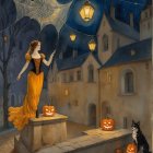 A whimsical autumn night scene features a woman in a flowing yellow gown standing on a pedestal by a cobblestone street. Lanterns glow softly, surrounded by pumpkins and autumn leaves.