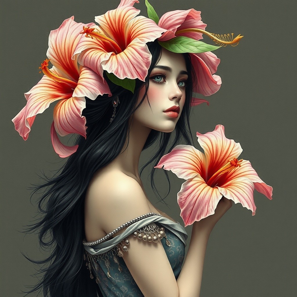 A woman adorned with large pink hibiscus blooms in her hair, holding a flower, against a muted background.