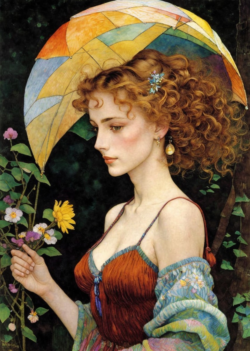 Artistic depiction of a woman with flowers in her hair, celestial motifs in the background, holding a plant stem, and elegant attire.