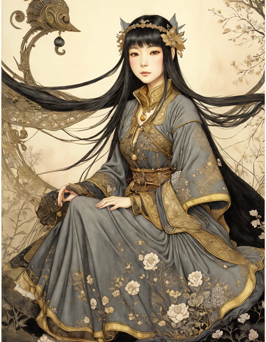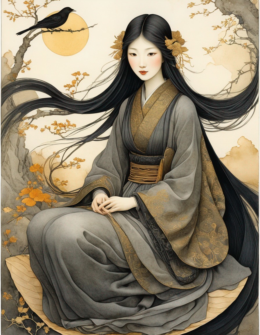 Legend of the Girl and the Singing Nightingale, Medieval Japanese Artists Sumi-e Style, Velvet Black, Shabby, Dull Gold, Amber Gray, Golden Ratio, Surreal Fantasy, Elegant, High Definition Ultra Fine 3D Line, Zenangle Style, Watercolor Patchwork ,