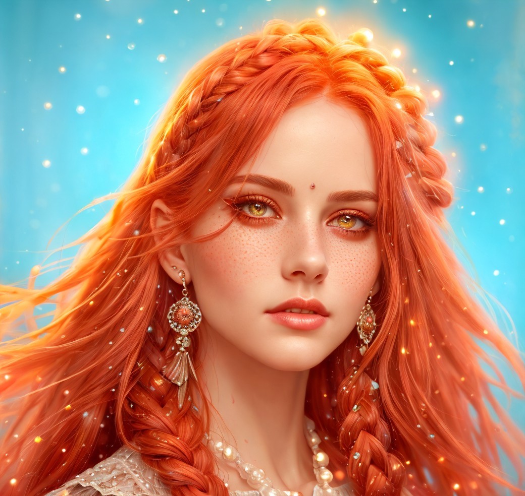 Upper body portraiture, beautiful female enchantress in edwardian blouse, crackles, crochets, contraptions, detailed red hair with braids, realistic devilish eyes, dynamic lighting 1.7, thickened paint , scid spill, high contrast, High coloring, detailed close-up portrait, stylized face, watery textures, dots and flares and splashes, soft edges, back-lit, triadic color scheme blue beige red, orange lighting, brushed paint, style of paint dripping technique, hues, gothic futurism, chiaroscuro lighting, 3d effects 1.8, intricate stylized hairstyle, brightness 1.7, stylized zentangle lines, abstract, coherent, hues, eerie, occult, retropunk, sweaty,, occult, Anglocore 1.9, auracore, high coloring 1.9, atompunk 1.7, raytraced shadows 1.9, retrofuturistic details of ornate, maximalism, radiance, silver particles, dreamy glow, tints of abstract art nouveau illustration, Kinky Pop Surrealism, Tints of 1970s advertising art, 3d effects 1.8, shadow mapping 1.3, dynamic lighting 1.7, ambient occlusion 1.5, anisotropic filtering 1.9, ethereal, otherworldly, dethereal, abstract style 1.7, hues, grain, blurry aura, fantasy movie still, synthetic essence, dark fantasy art, stylized, geometrical, octane render illustration 1.5, tints of Margaret Keane,