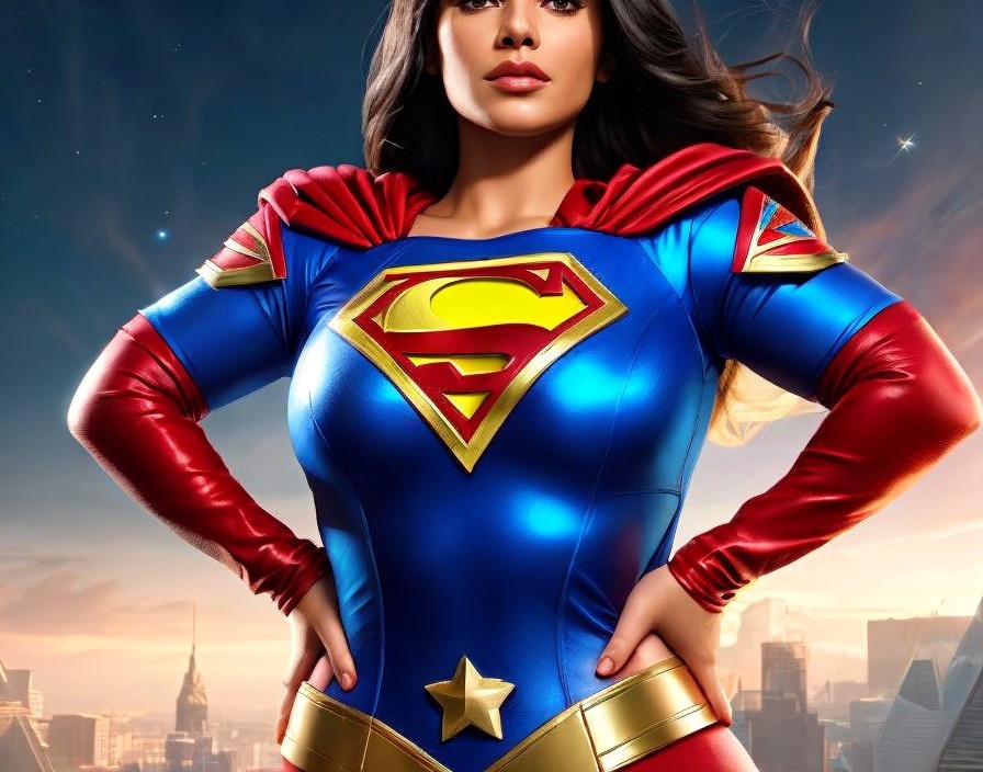 A digital artwork of a female superhero with a red cape and blue costume emblazoned with a distinctive 'S' logo, against a sunset sky.