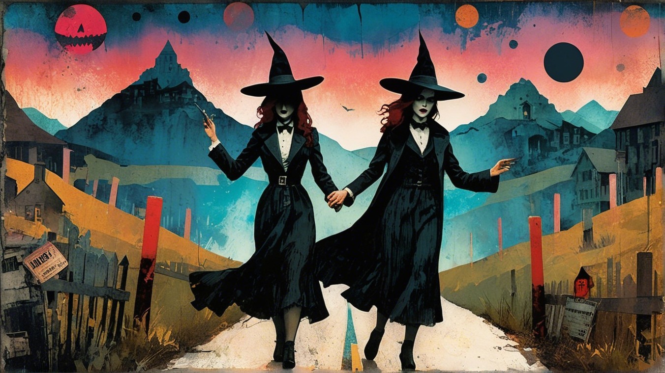 Two witches in dark gowns hold hands, walking down a winding road. The sky is a blend of vibrant colors, with mountains and silhouettes in the background, adding a mystical, spooky ambiance.