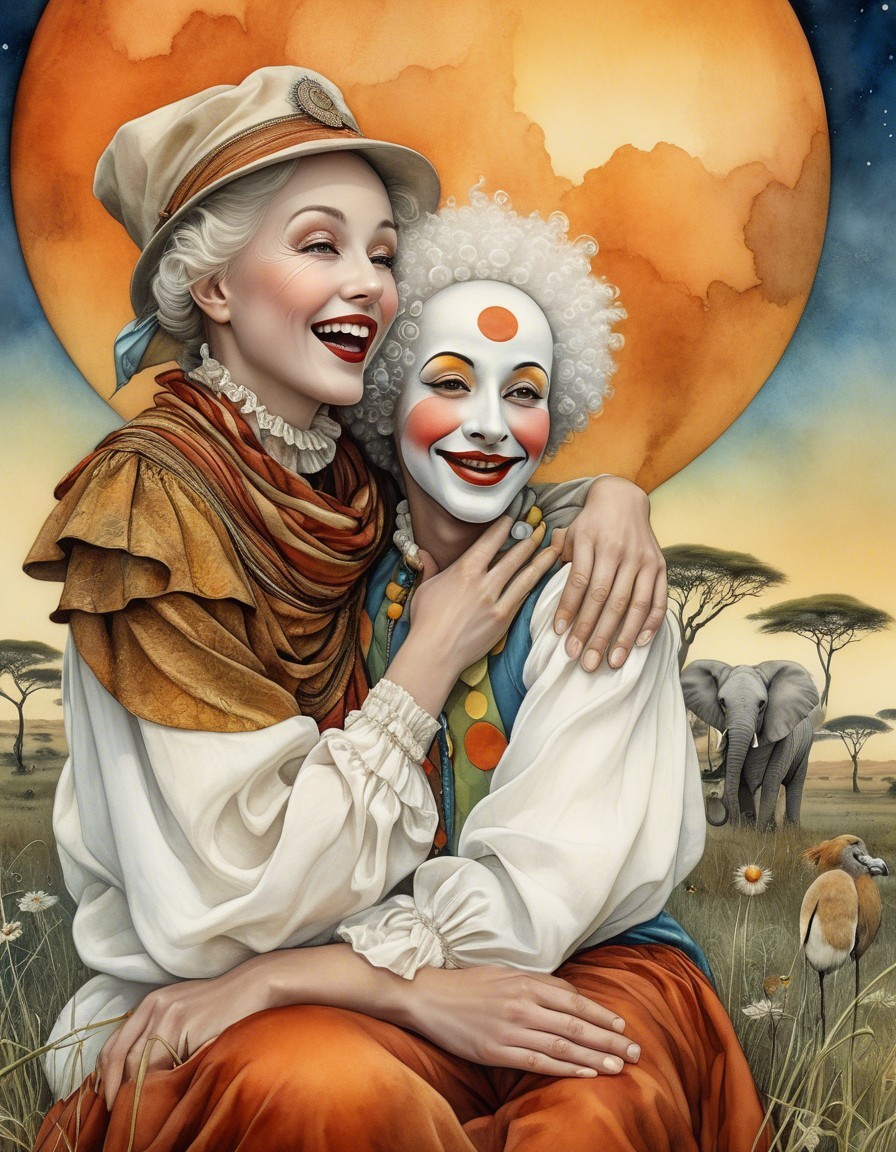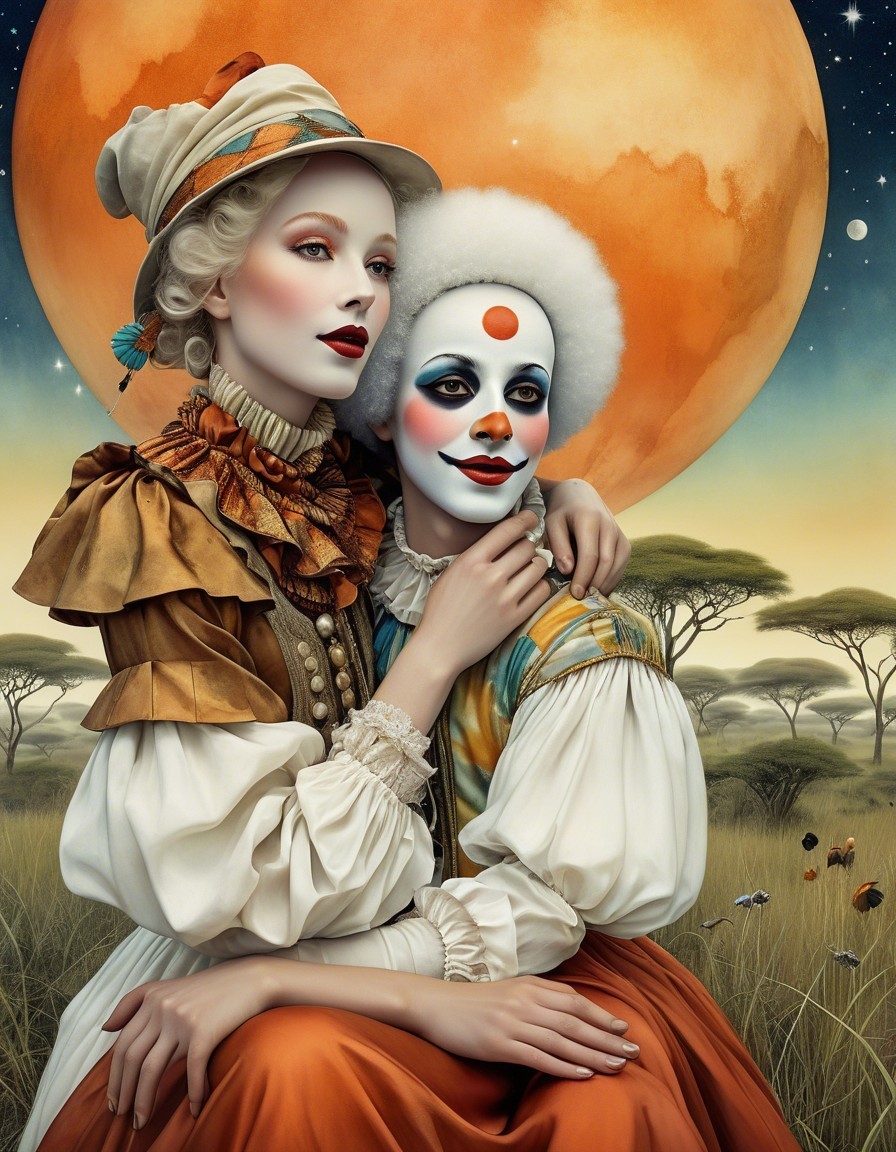 A whimsical clown with vibrant, curly hair and a joyful expression, adorned with white flowers. She wears an elegant, ruffled outfit against a backdrop of a glowing, large moon and savanna landscape.