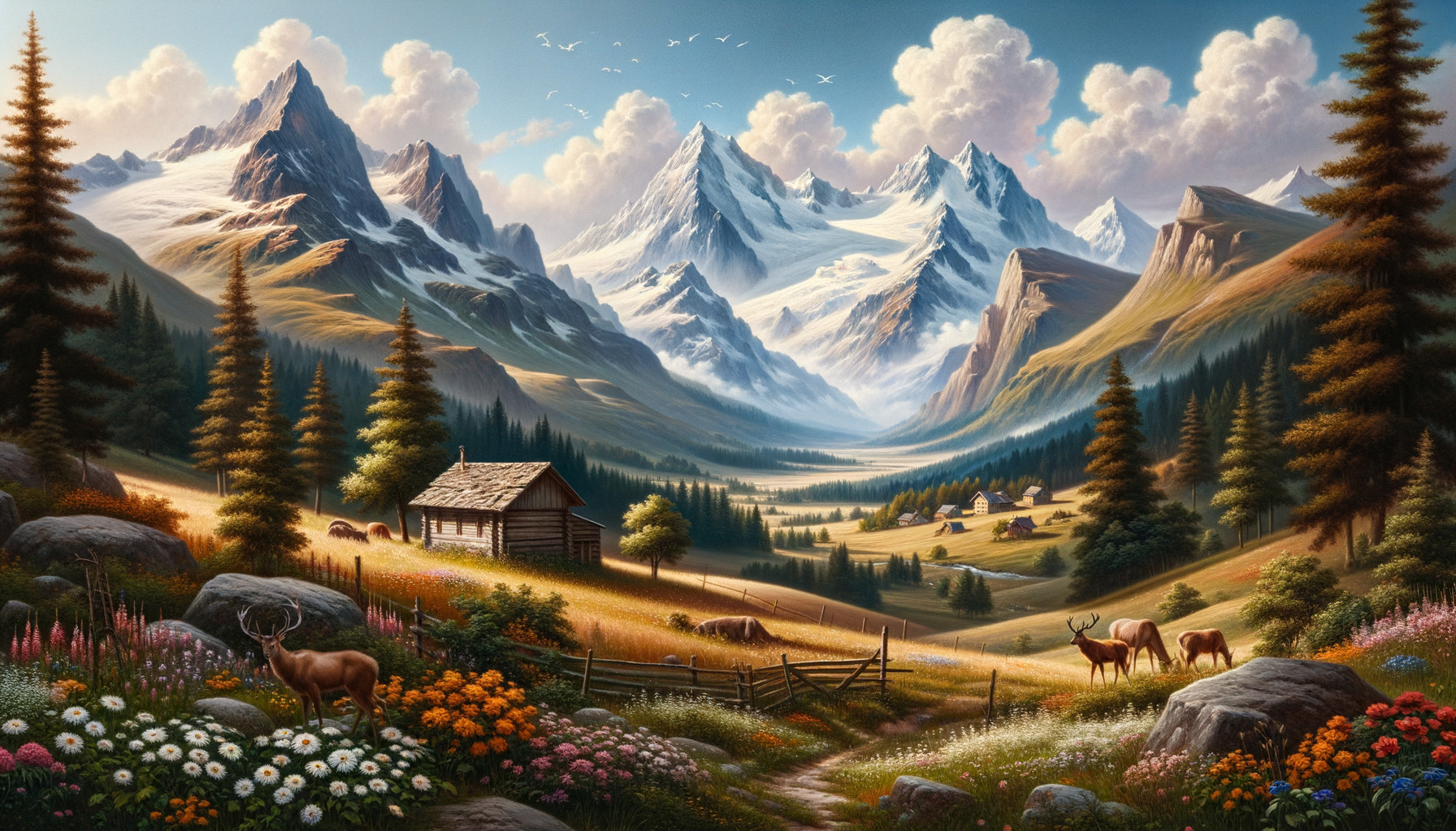 A serene landscape featuring a meandering river, wooden cabins, lush valleys, and majestic snow-capped mountains under a clear sky.