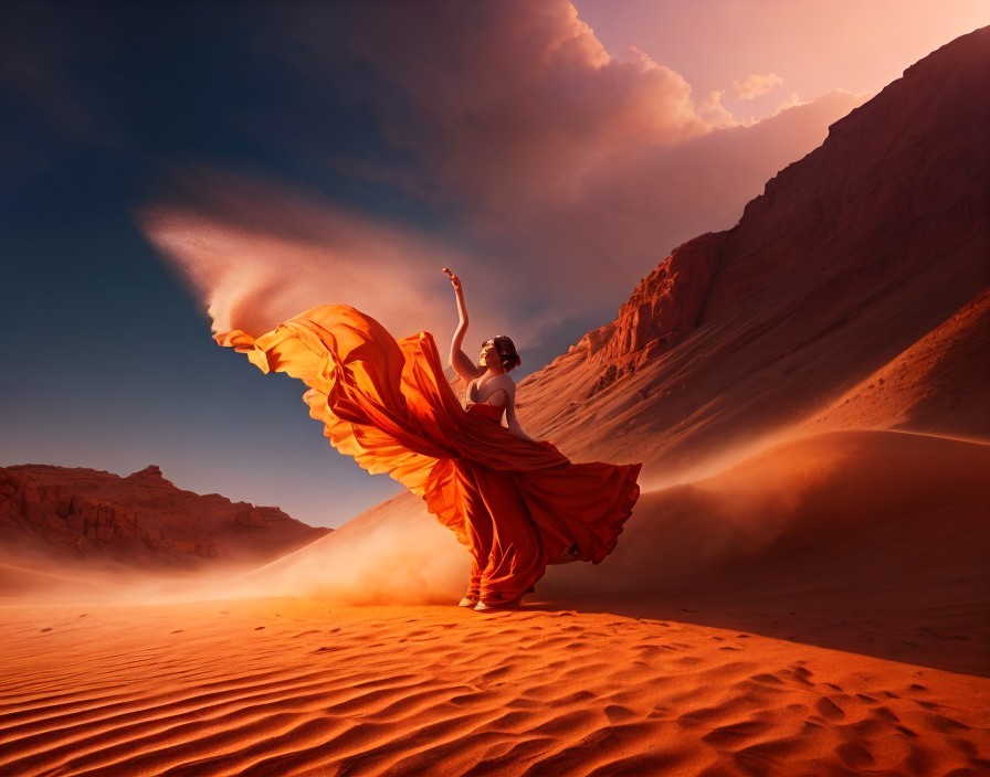 A woman dances in a desert, her flowing dress billowing in the wind against a backdrop of stunning red dunes and rock formations.