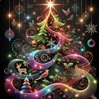 A vibrant, swirling Christmas tree adorned with colorful ornaments and intricate patterns. Surrounding it are sparkling stars and decorative snowflakes, creating a magical festive atmosphere.