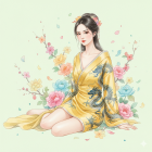 A young woman in an elegant kimono with golden accents poses gracefully against a dreamy background featuring a full moon, lush leaves, and a majestic dragon surrounded by pink flowers.