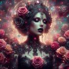 A stunning woman adorned with a crown of intricate gold and vibrant roses, surrounded by a mystical garden. Her makeup is dramatic, enhancing the ethereal glow of her serene expression.