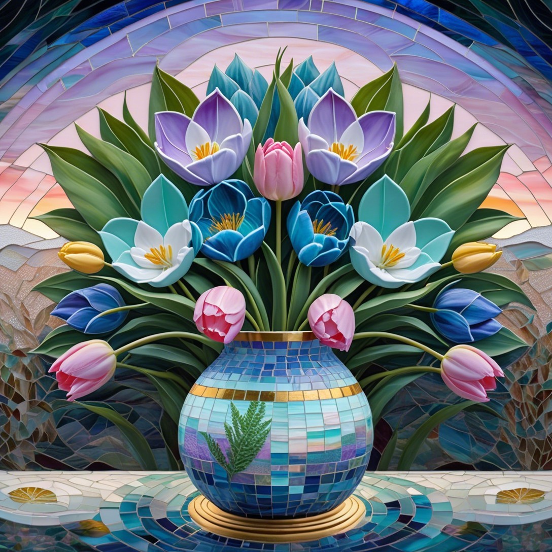 A vibrant mosaic vase overflows with colorful flowers, including tulips and blue blooms, framed against a softly lit, abstract background that evokes a serene dawn.