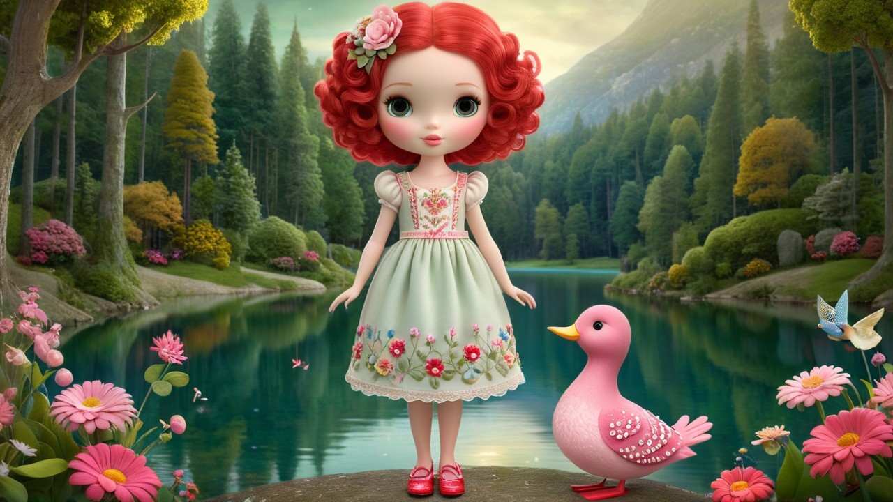 (Try from Crystal) -A whimsical scene featuring a doll with vibrant red curls, dressed in a pastel dress adorned with flowers, standing by a serene pond alongside a pink, cartoonish duck, surrounded by lush greenery.