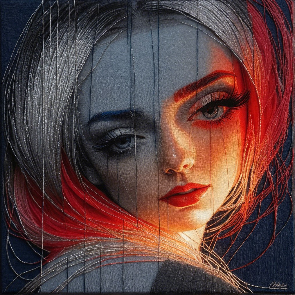 A striking portrait of a young woman with intricate, flowing hair in shades of silver, orange, and blue. Her expressive eyes and smooth skin create a captivating, modern aesthetic.