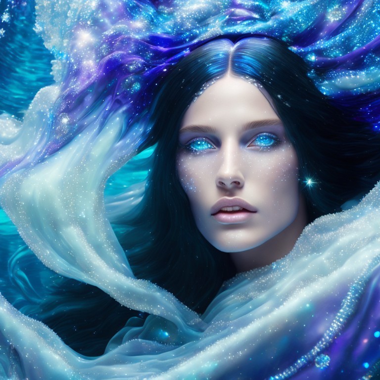 A fantasy image of a woman with blue eyes and hair resembling a starry night sky, adorned with a silver tiara.