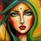 The image features a woman with striking features, holding a glass of golden liquid. She wears an elegant headscarf with vibrant colors, set against a rich, warm background, exuding a serene and regal presence.