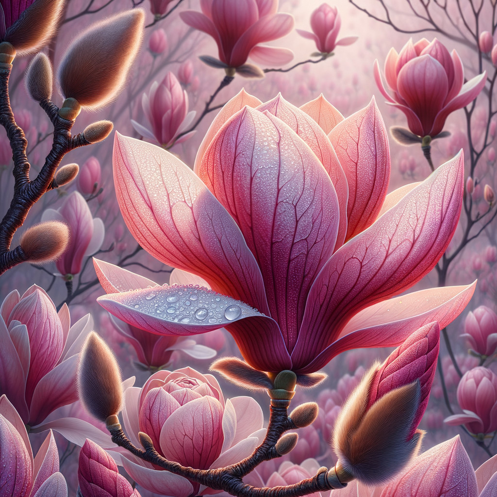 Close-Up of Pink Magnolia Blossom with Raindrops