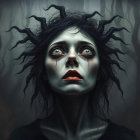 A haunting figure emerges from a shadowy forest, with wild hair resembling serpents, pale skin, and wide, eerie eyes. Dark teardrops streak down her cheeks, enhancing the chilling atmosphere.