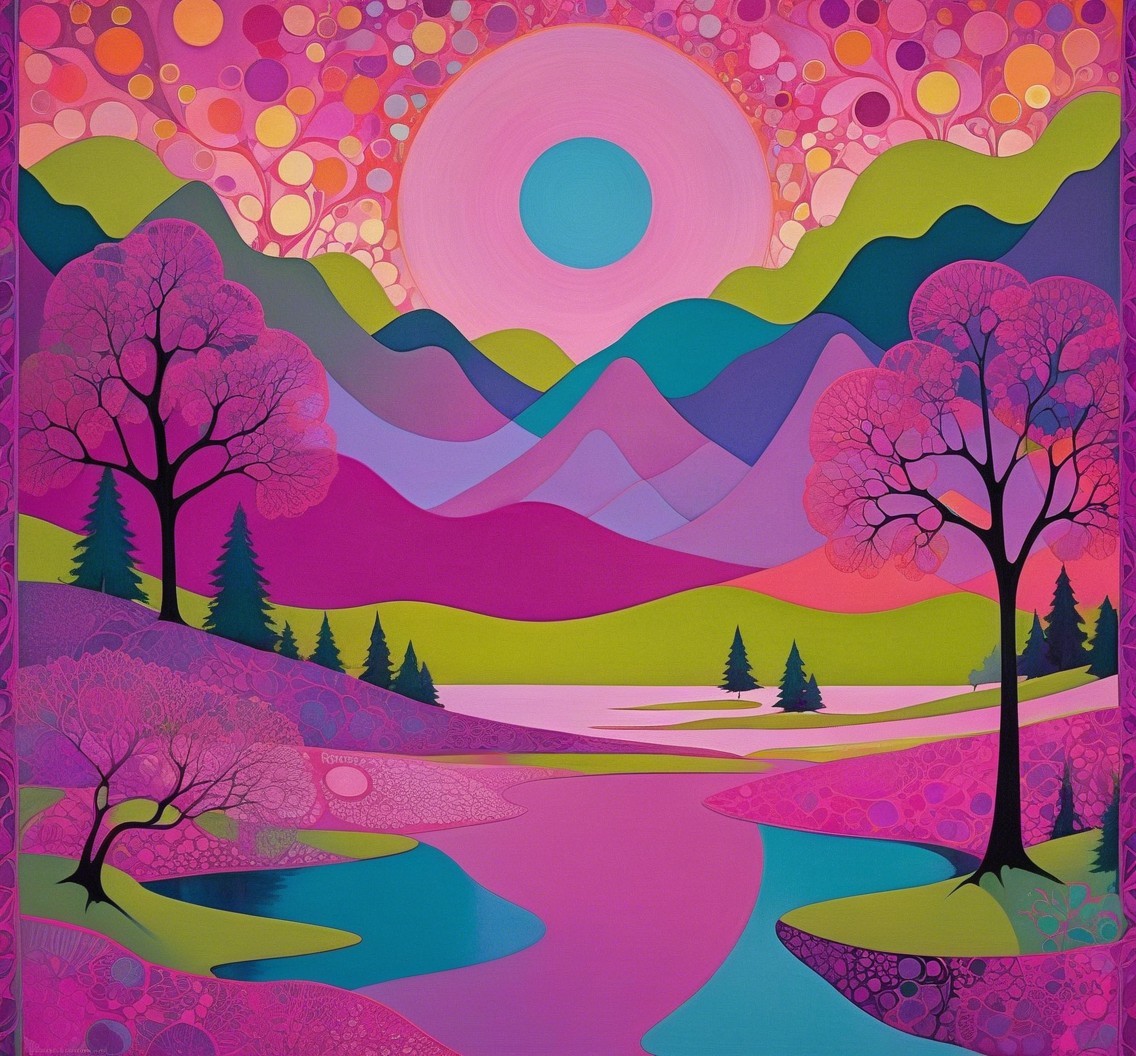 A vibrant landscape featuring bold, swirling mountains in shades of pink and purple, dotted with whimsical trees. A serene river reflects the colorful sky, exuding a dreamlike, psychedelic atmosphere.