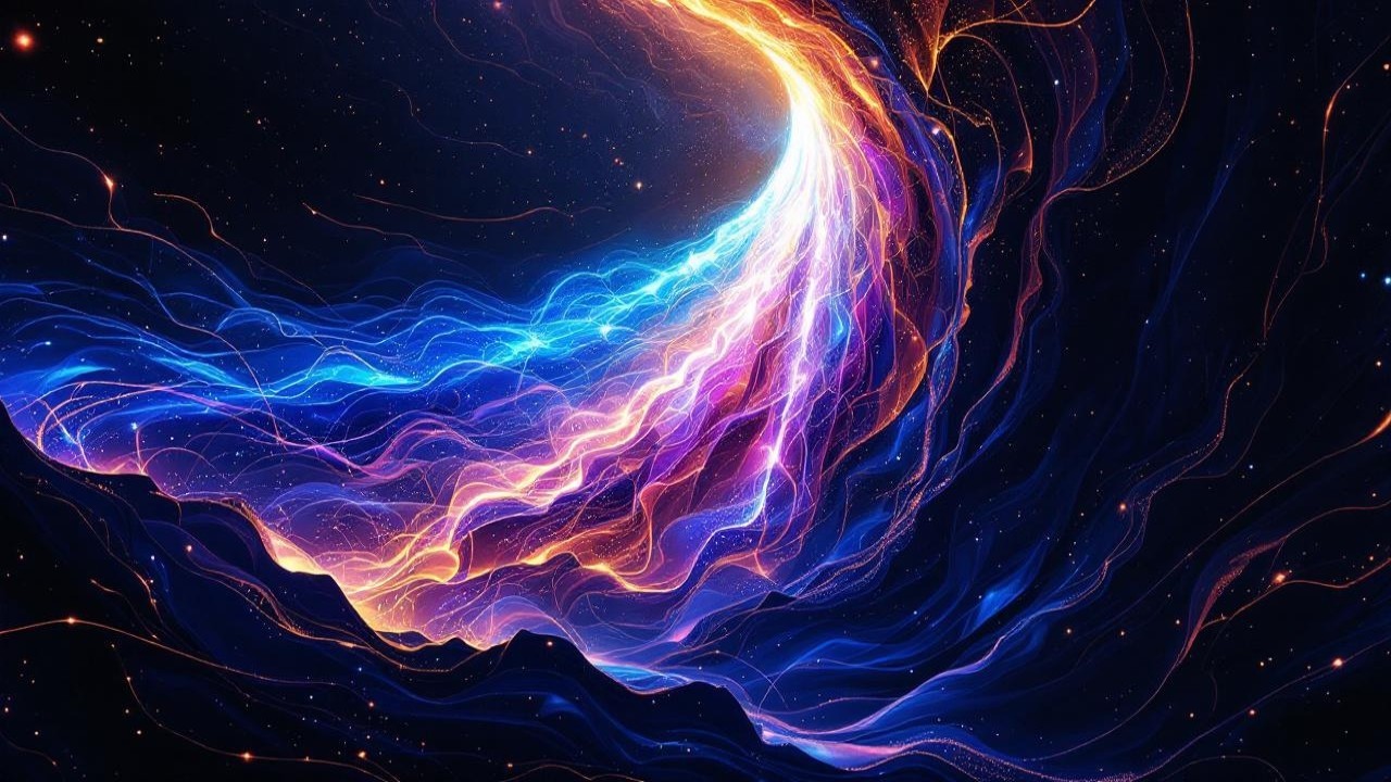 A mesmerizing digital artwork features a lighthouse beam morphing into liquid light, cascading into a dark abyss. Exotic patterns intertwine in a glowing descent, set against a deep void with shimmering lights. Dynamic colors and gradients enhance the ethereal journey through this otherworldly landscape.