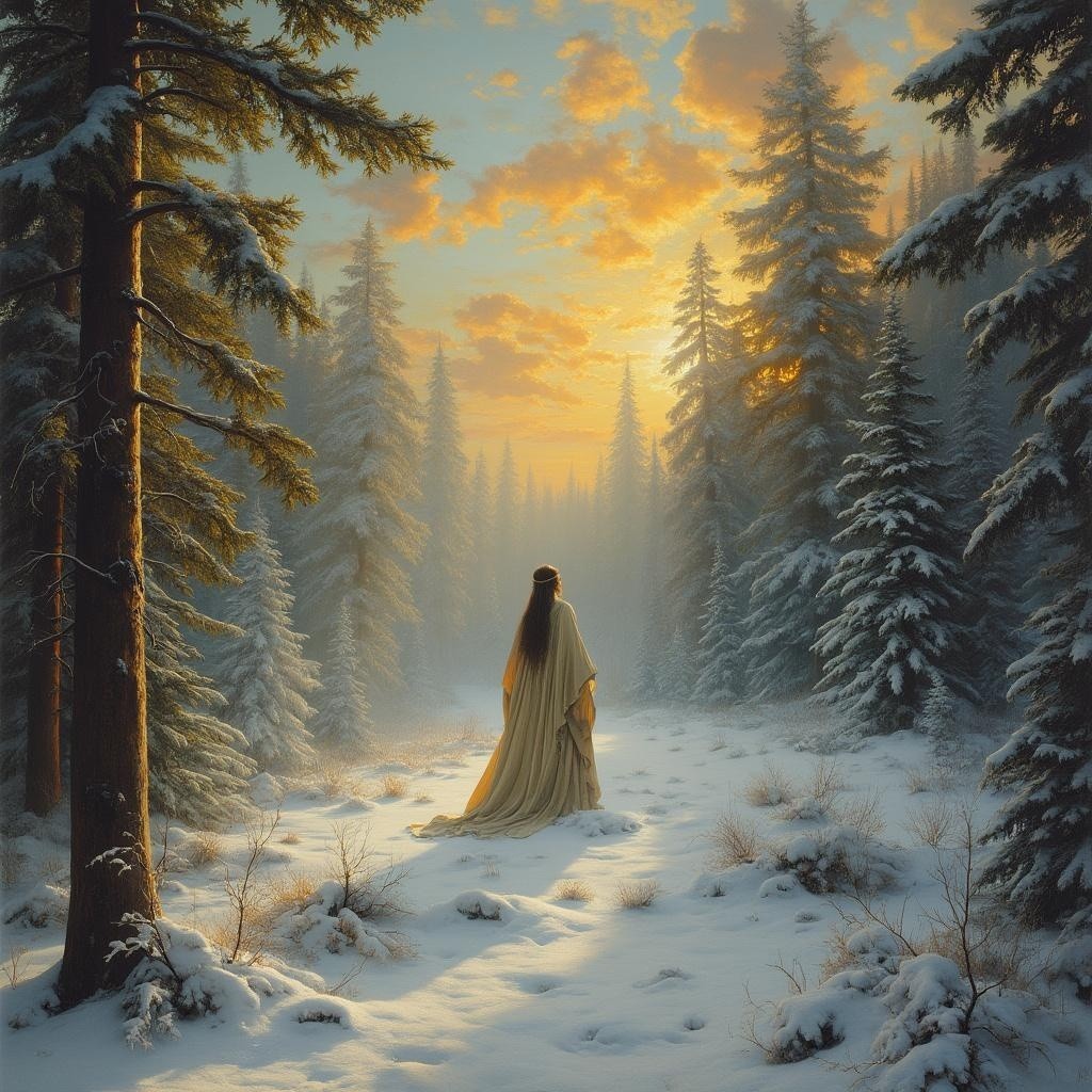 A serene winter landscape featuring a figure in a flowing cloak, standing among tall evergreen trees. Soft sunlight filters through the branches, casting a warm glow over the snow-covered ground.
