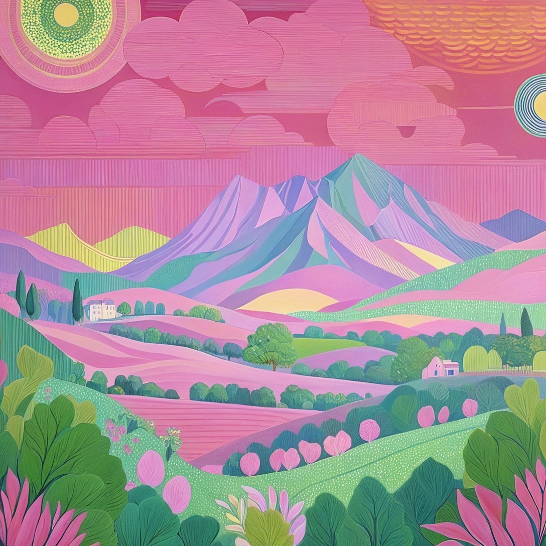 A serene landscape features rolling hills and a quaint village with pastel-colored rooftops, set against a vibrant pink sky and a softly glowing sun behind a distant mountain.