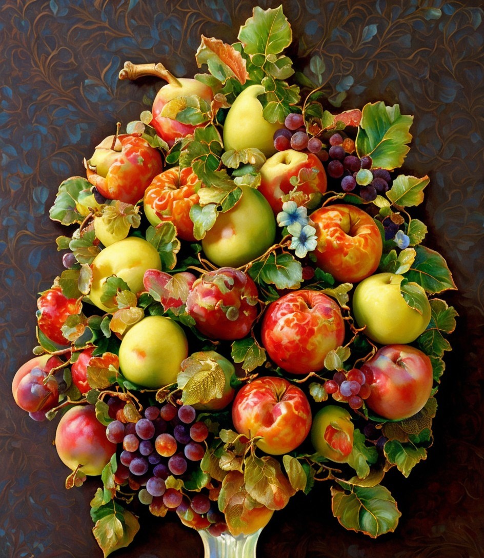 + Prompt:3D. Shiny various porcelain fruits and bright blue flowers in a high tall patterned porcelain bowl, bright colorful, vibrant, oranges, pears, figs, red grapes, brown branches, fresh green vine leaves, dark patterned wallpaper, shadows from the side intricate shadows for depth and contrast.