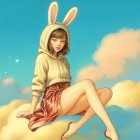 A young woman sits on a fluffy pink cloud, wearing a yellow hoodie and bunny ears, with a flowing skirt. The sky is vibrant, filled with stars and a dreamy atmosphere.