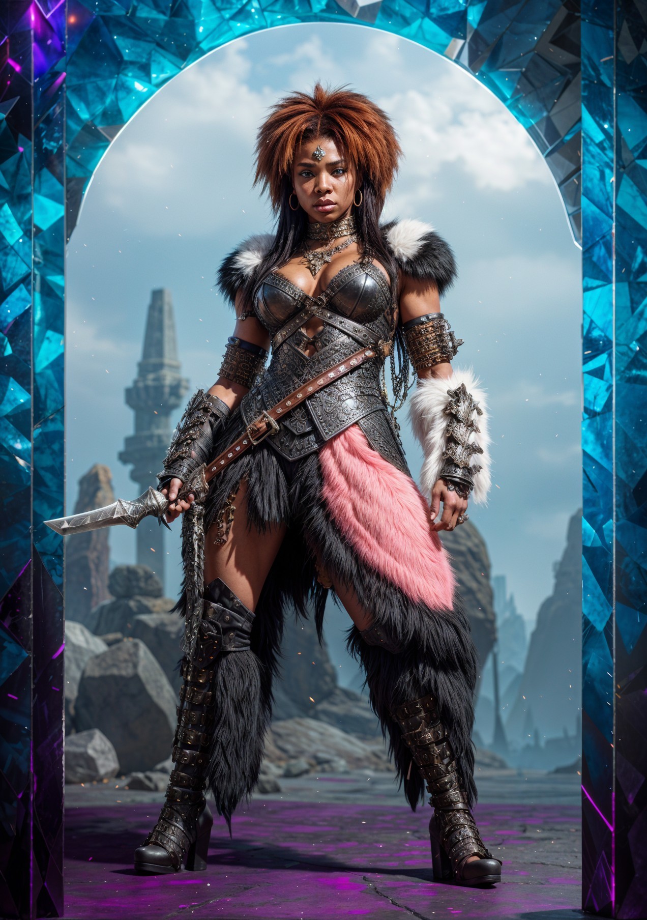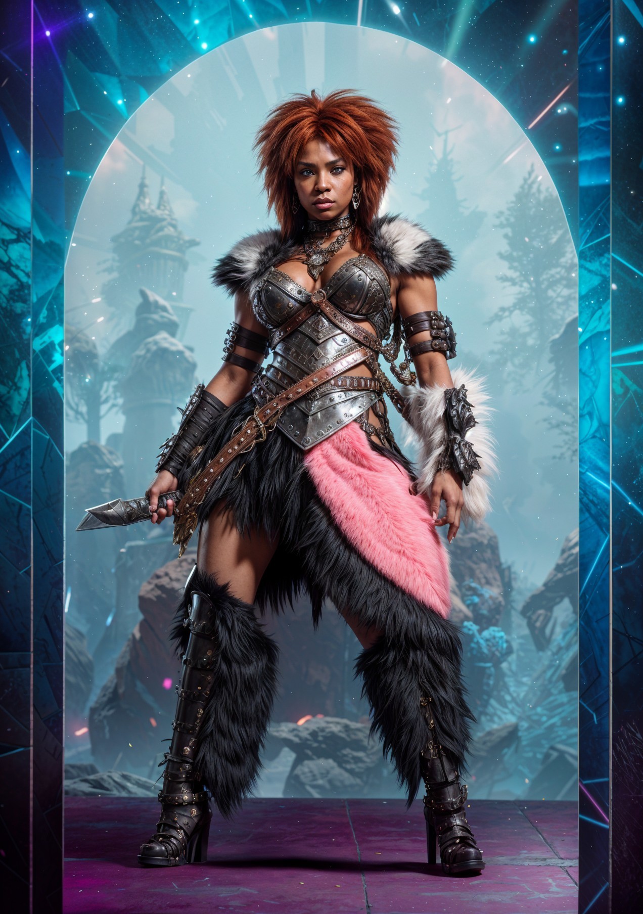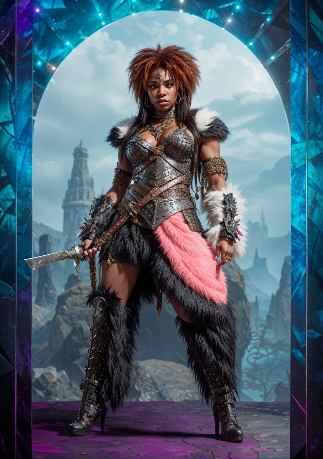 A fierce warrior stands confidently in a stylized outfit with fur accents, wielding a sword. The backdrop features a mystical landscape, enhancing her powerful presence.