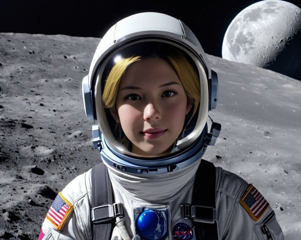 A 17-year-old girl stands confidently on the moon in 2027, wearing a spacesuit and an astronaut command cap. The lunar landscape stretches around her, highlighting her adventurous spirit and dreams of exploration.