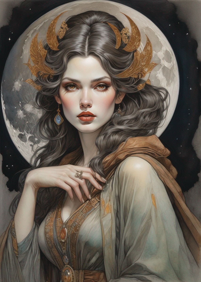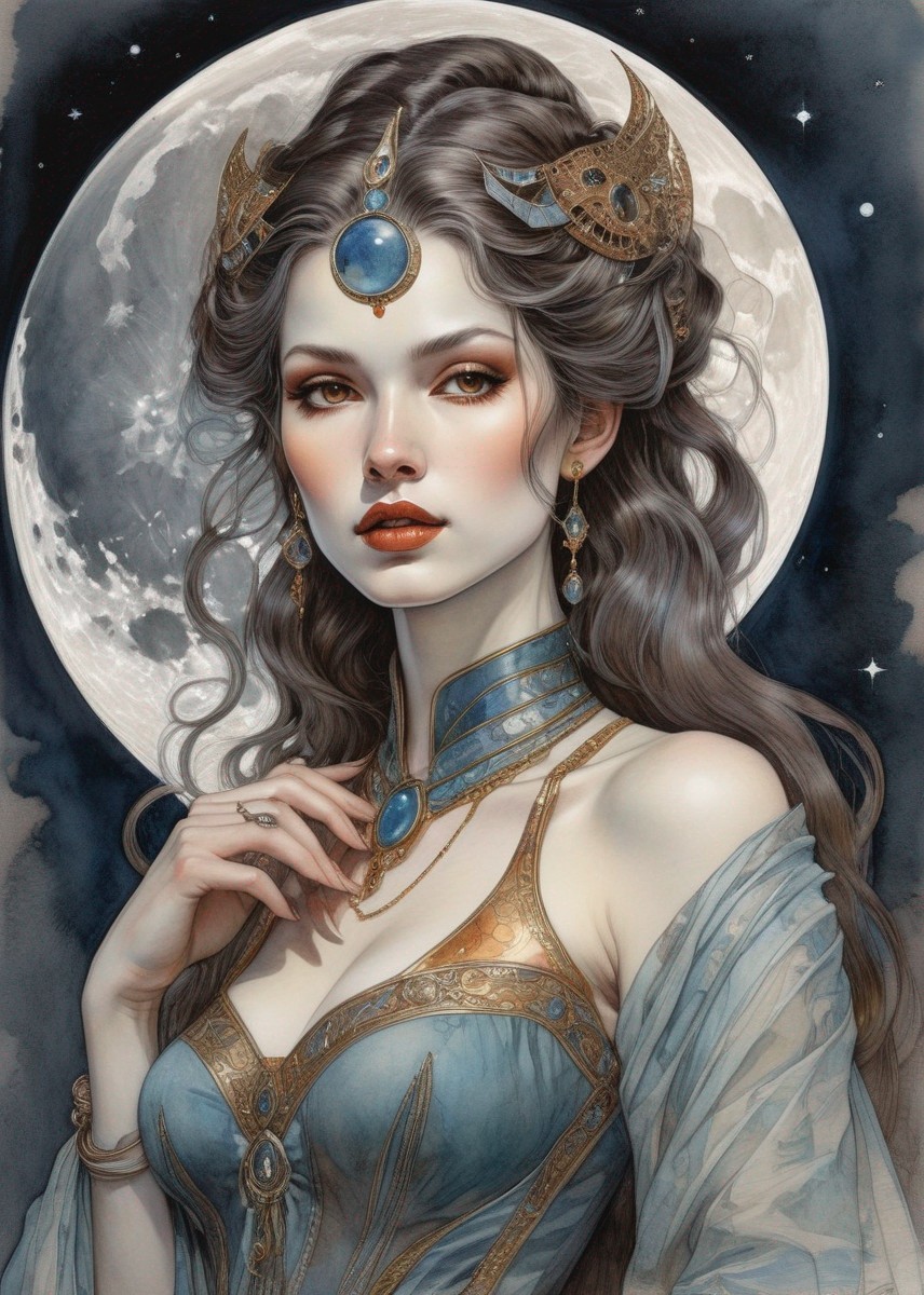 Fantasy Portrait of Woman with Moon Crown and Jewelry