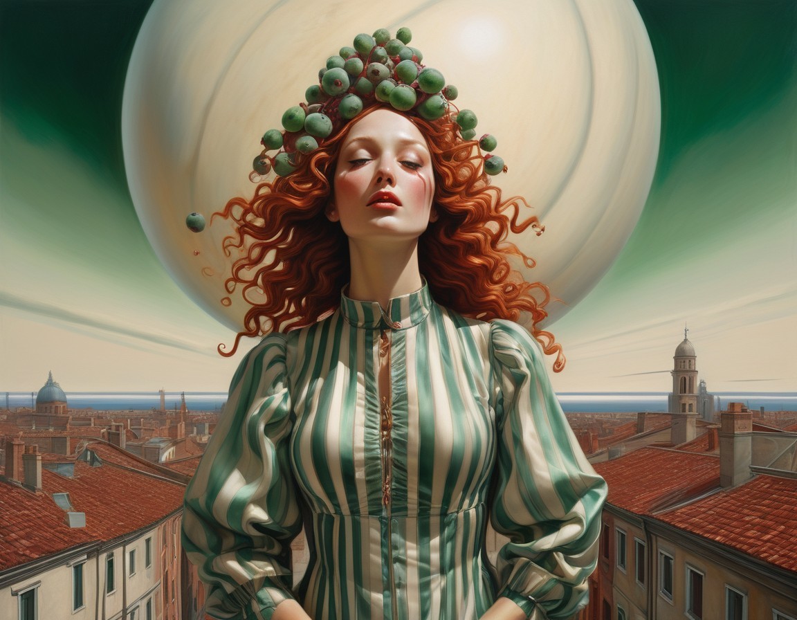 A surreal portrait of a woman with flowing red hair, grapes atop her head, against an Italian townscape under a large moon.