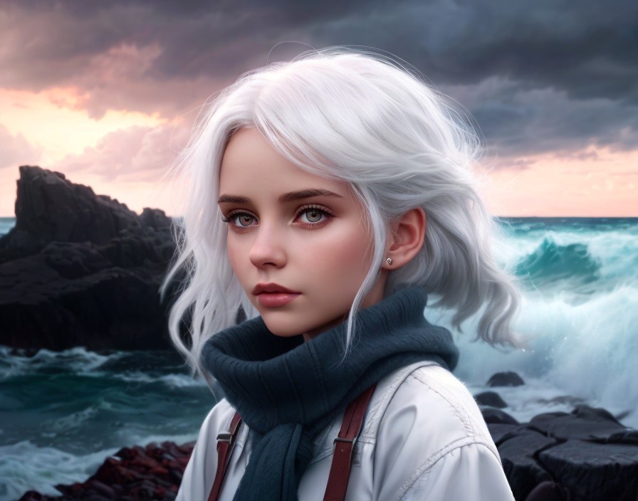 A digital portrait of a woman with white hair and blue eyes against a stormy seascape backdrop with crashing waves and a dramatic sunset.