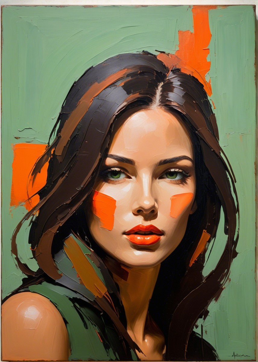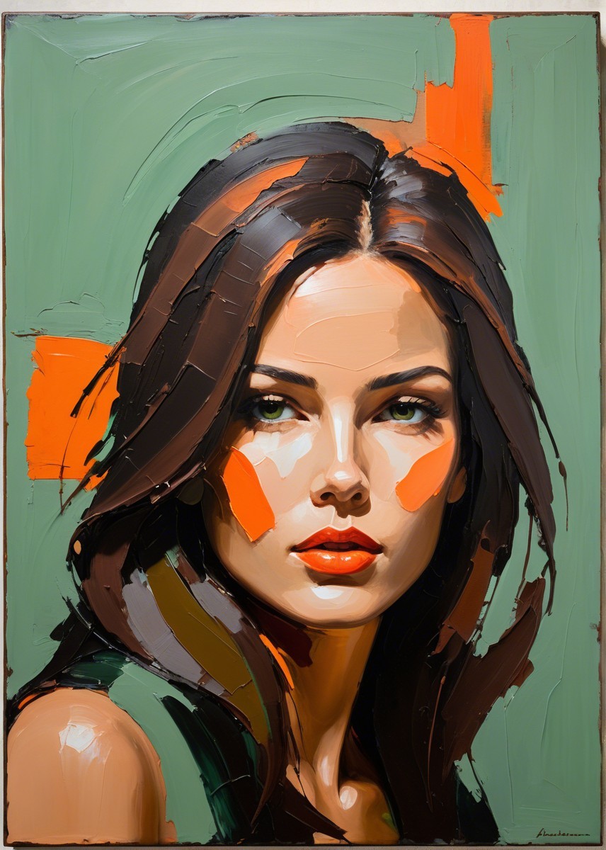 Dark, textured abstract expressionist painting, prominent brushstrokes, multi-layered tones, centered figures, abstract and sculptural style, gestural movement, muted color palette, depth through brushstroke density, diffused cool lighting, abstract realism, expressionism, impasto technique, perfect female breast profile, bold brushstrokes, green, orange, red, brown, gray, yellow palette, light and shadow interplay, volume and shape, dynamic composition, energetic paint application, Fauvism, early 20th-century modern art, Van Gogh inspired, emotional energy, bold mood.