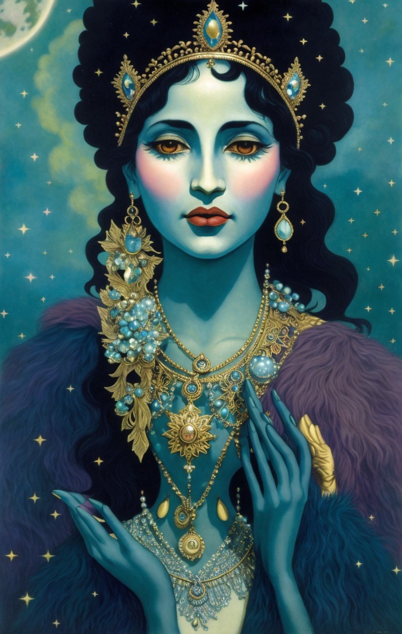An illustration of a woman with moon-like features, elaborate jewelry, a halo, dark blue attire, and a cat at her side under a starry sky.