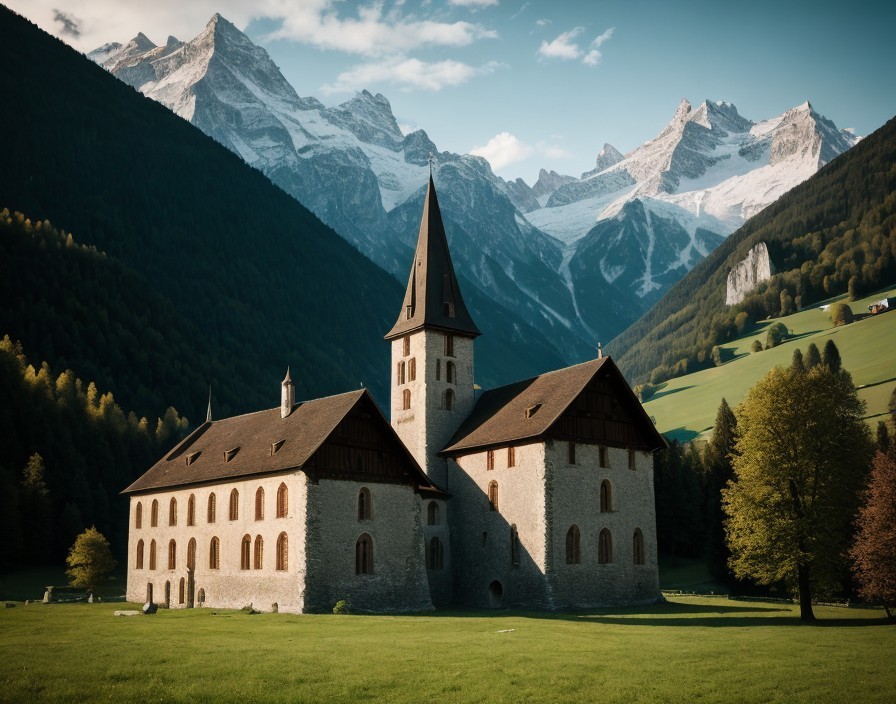A majestic church with a spire nestled in a lush valley against a backdrop of dramatic, jagged mountains under a clear blue sky.