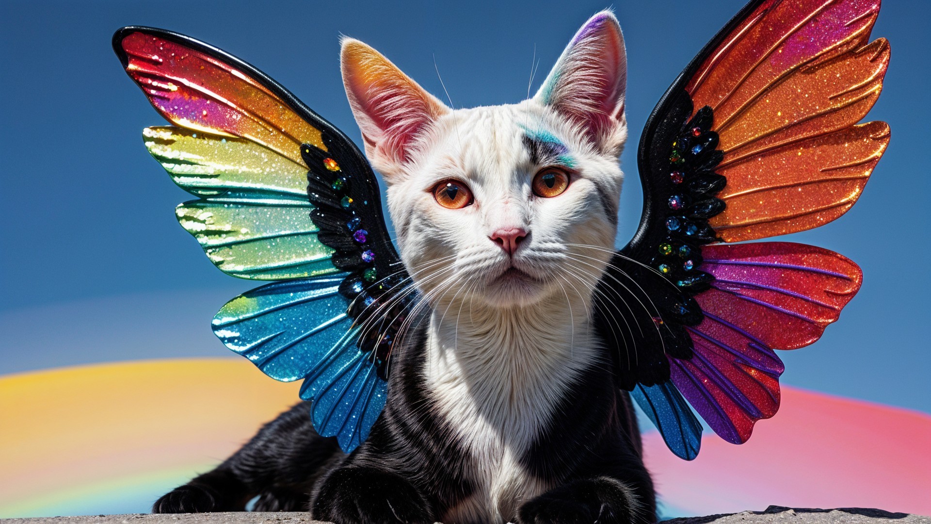 A whimsical cat with striking black and white fur dons vibrant, sparkly butterfly wings in rainbow colors, set against a bright blue sky, exuding a playful and magical vibe.