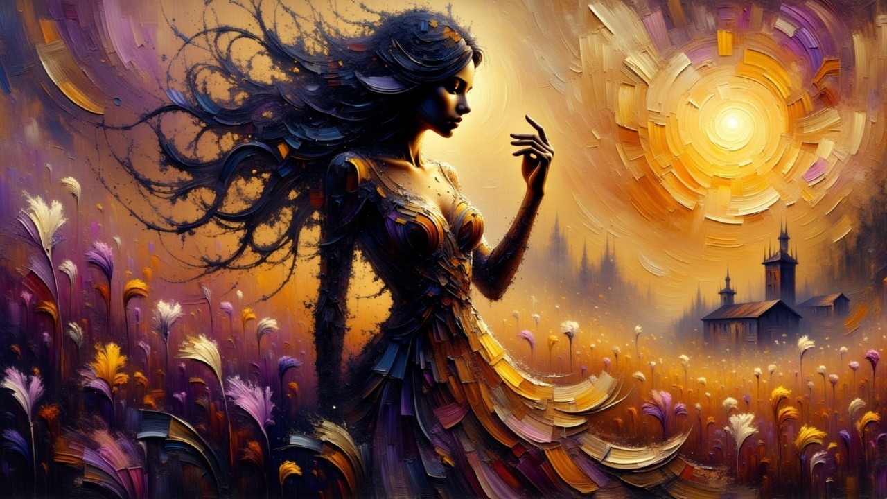 A striking oil on canvas painting features a dark silhouette of a woman amid a vibrant background. Rich layers of black, dark purple, brown, and gold create a captivating, textured fantasy scene.