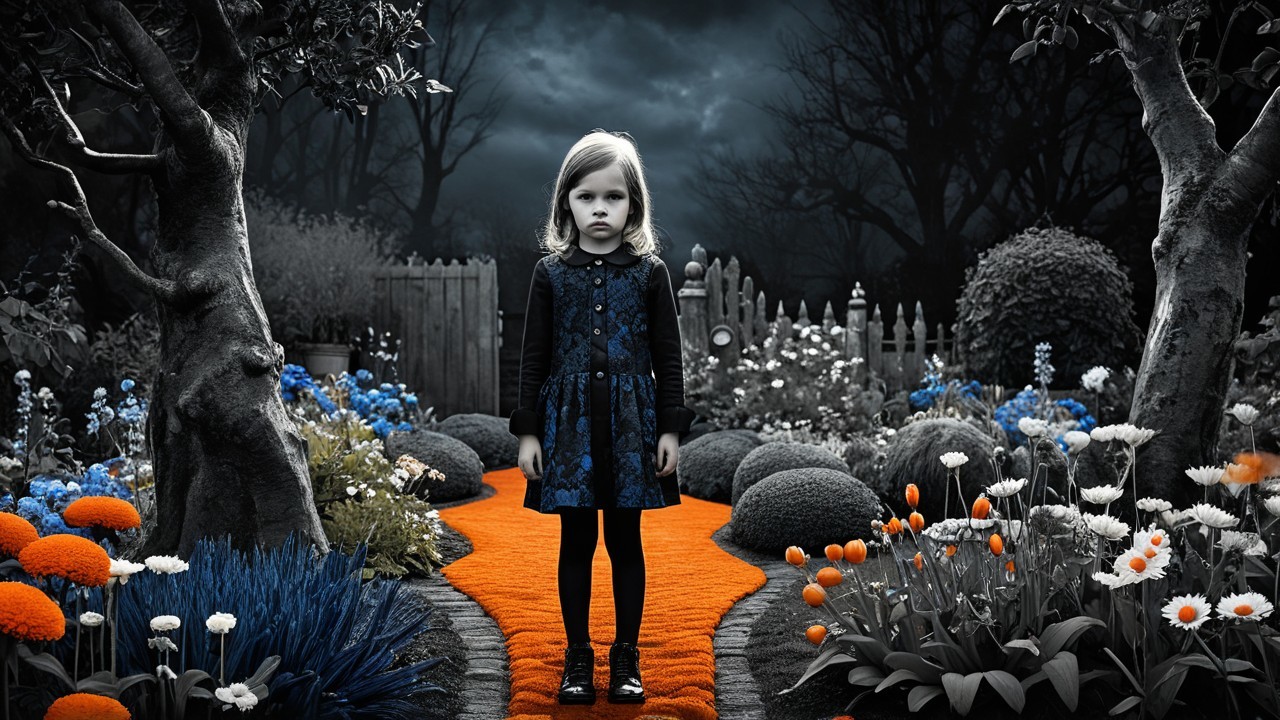 (Try from Aaron Gerschler) - A solitary girl stands on a vibrant orange path in a monochrome garden, surrounded by vivid flowers and dark trees, evoking a sense of mystery against a dramatic sky.