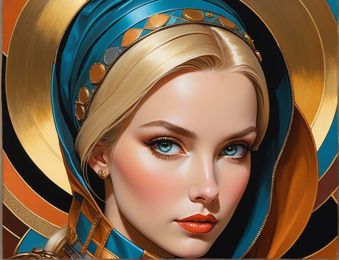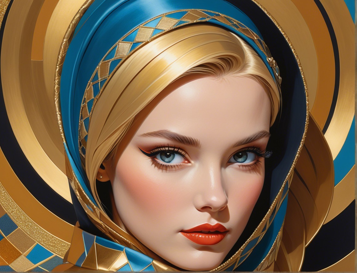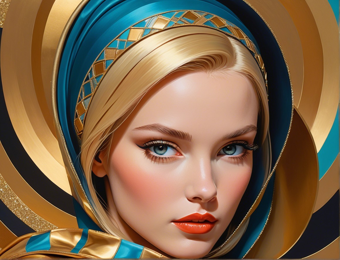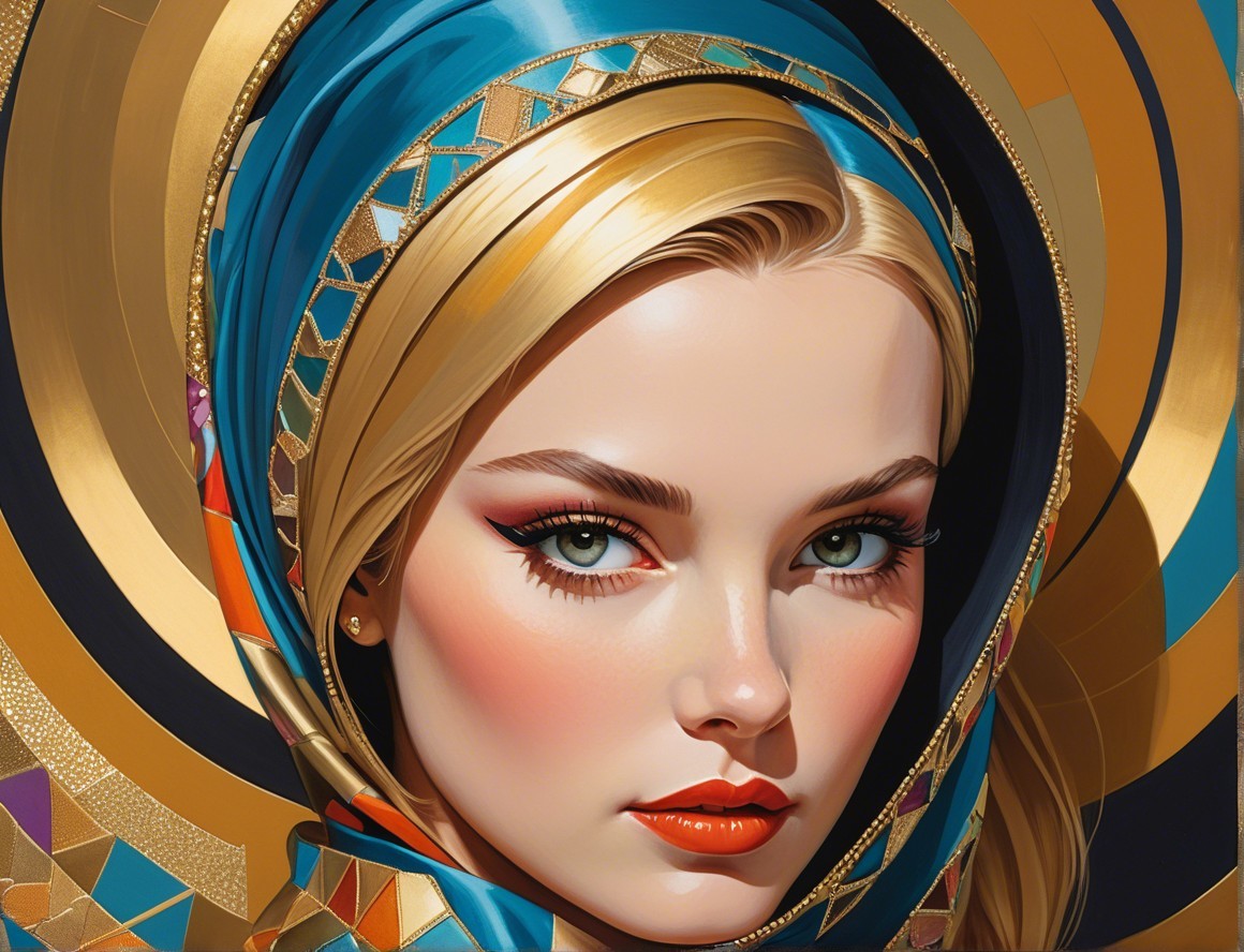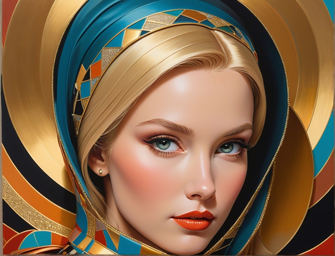A close-up portrait of a woman with striking blue eyes and blonde hair, adorned in a colorful headscarf and surrounded by intricate golden and turquoise patterns. Her expression is serene and captivating.
