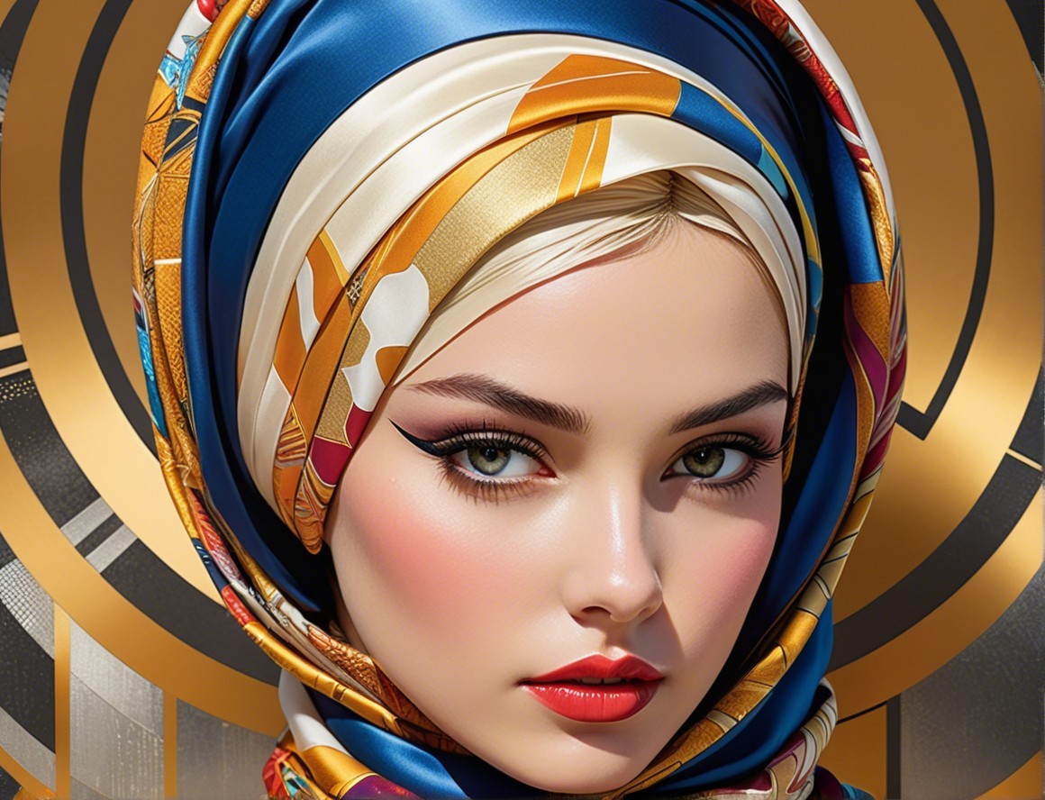+ Prompt:Captivating stylized portrait, intricate patchwork design, metallic shimmer, detailed linework patterns, plasticity in features, unique stacked-up perspective, adorned with a satin headscarf, artistic blotting effects, delicate overspray of thinned paint, fusion of stylized comic book, pulp art and technical illustration, alluring female figure with attitude, vibrant experimental color enhancements, shot with the vintage Ilford Sprite 35-ii Reusable 35mm Camera, dynamic hatching technique, exclusive focus on curves, rich dyed hues, layered textures with subtle rippled outlines, raytraced shadows for depth, artistic divisionism and tonalism, sculpted retrofuturistic elements, a touch of foampunk aesthetic, vibrant saturated colors, using new media pastel and graphite on paper, colorful squiggly lines, cubistic fractalization, mesh of colors, a pop art nightmare with contouring outlines, alcoholic effect on the right edge, symmetrical composition, maintaining aesthetic integrity through ho baron-inspired tints, watercolor patchwork technique, hues reminiscent of David Graeme Baker and Todd Lockwood, simplistic yet mysterious storybook illustration reminiscent of John Buscema, rendered in UHD with HDR and VFX, utilizing Octane render for high coloring and brightness. Overall composition by bob eggleton. 64K rendering