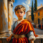A young boy dressed in a vibrant red toga stands by a classical stone column, with a serene courtyard and fountain in the background, exuding a sense of ancient elegance and charm.
