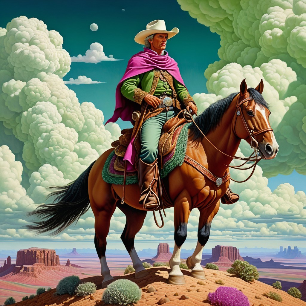 A heroic cowboy with a white hat and a vibrant cape stands majestically on a horse. The scene features colorful rocks and an expansive sky, with surreal planets and puffy clouds in the background.