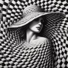 A striking black-and-white illustration features a woman in a wide-brimmed hat, surrounded by a swirling checkered pattern that creates a mesmerizing optical illusion.
