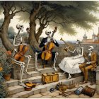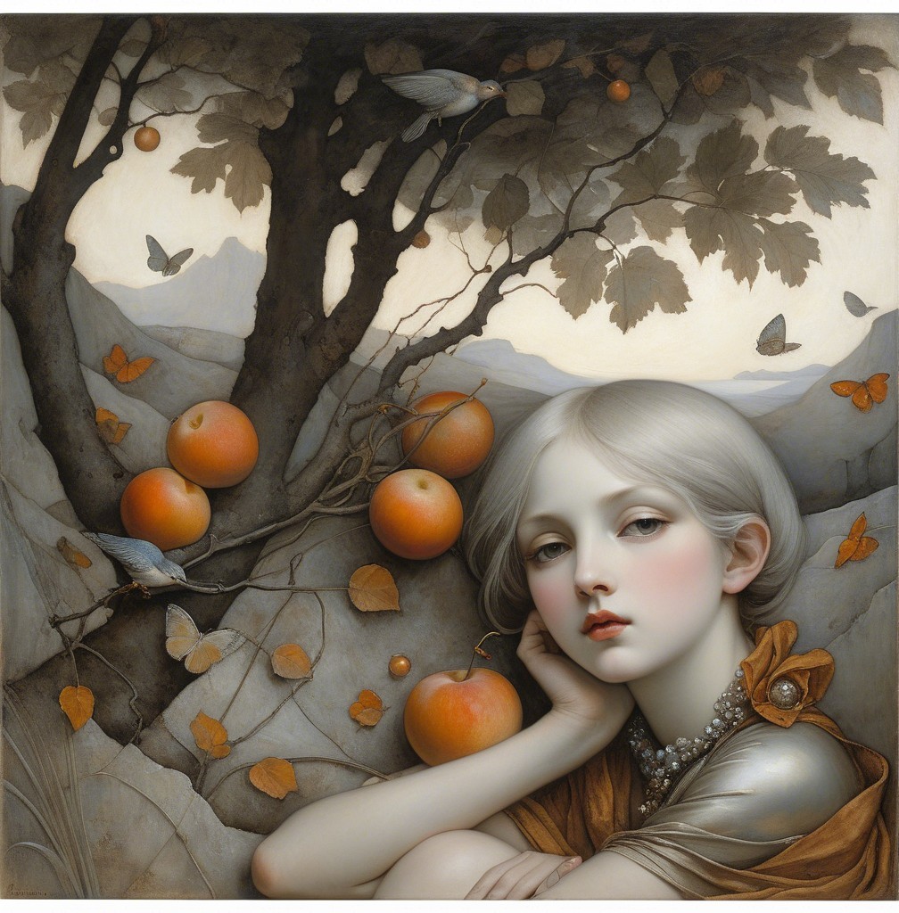 A graceful woman in a flowing white gown extends a delicate fan, surrounded by swirling floral motifs and a large luminous moon, embodying elegance and enchantment in a dreamlike scene.
