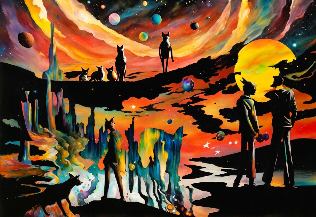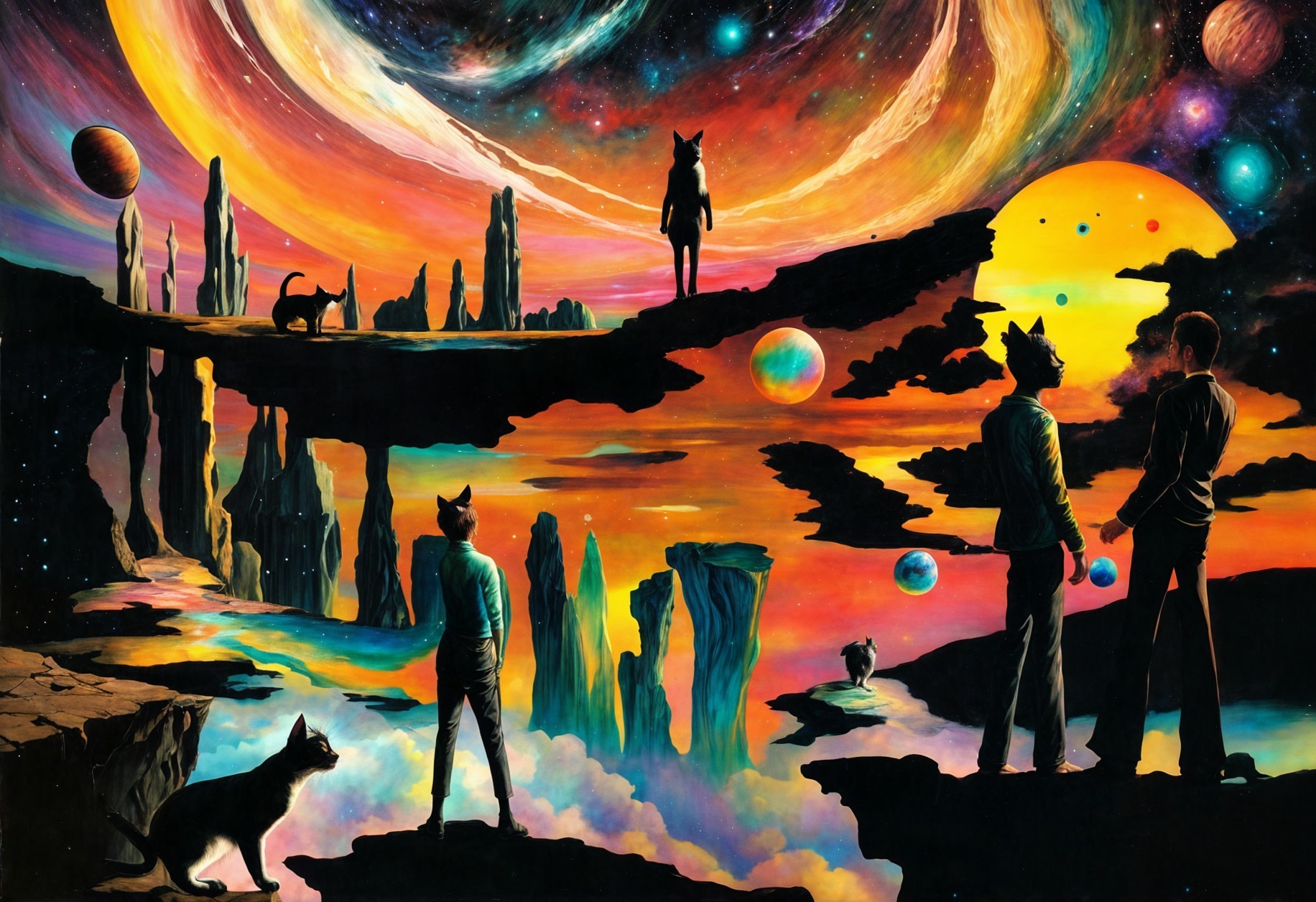 A surreal landscape where two figures in hoodies and cats stand atop vibrant cliffs, gazing at a cosmic sky filled with planets, swirling colors, and waterfalls reflecting an otherworldly glow.