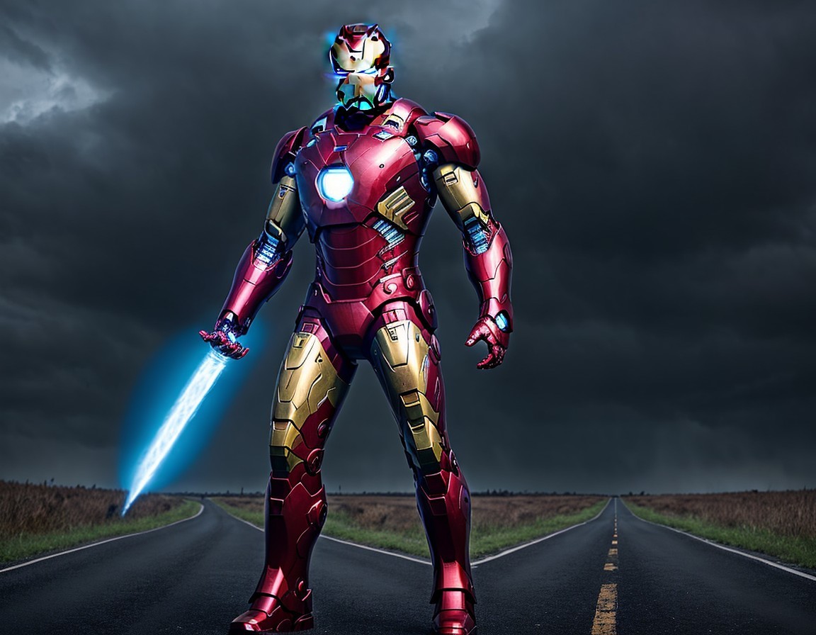 Iron Man in suit with repulsor beam activated, standing on a road with stormy skies in the background, another character in the distance.