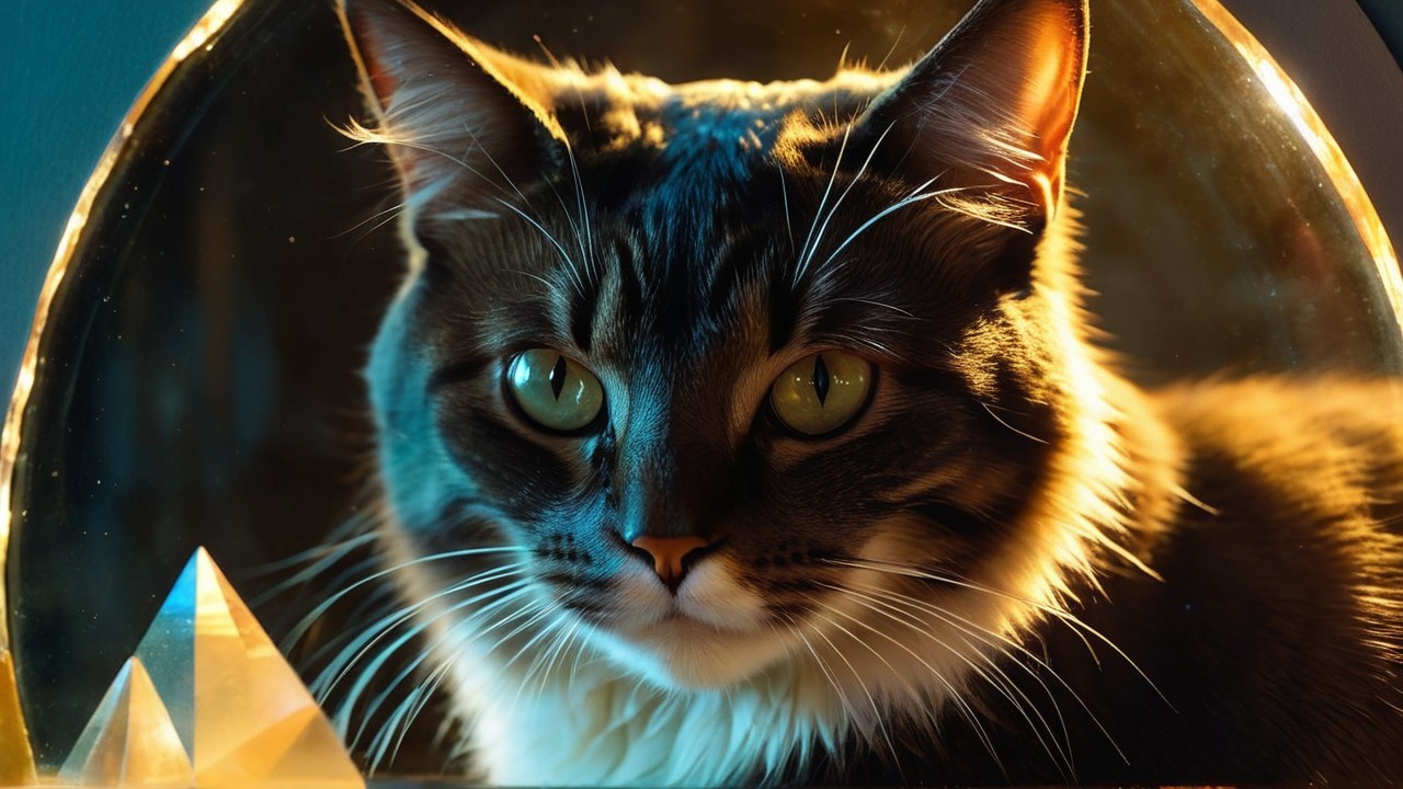 A close-up of a cat with striking green eyes and dark fur, illuminated by soft, warm light. A crystal pyramid glimmers nearby, adding a mystical touch to the scene.