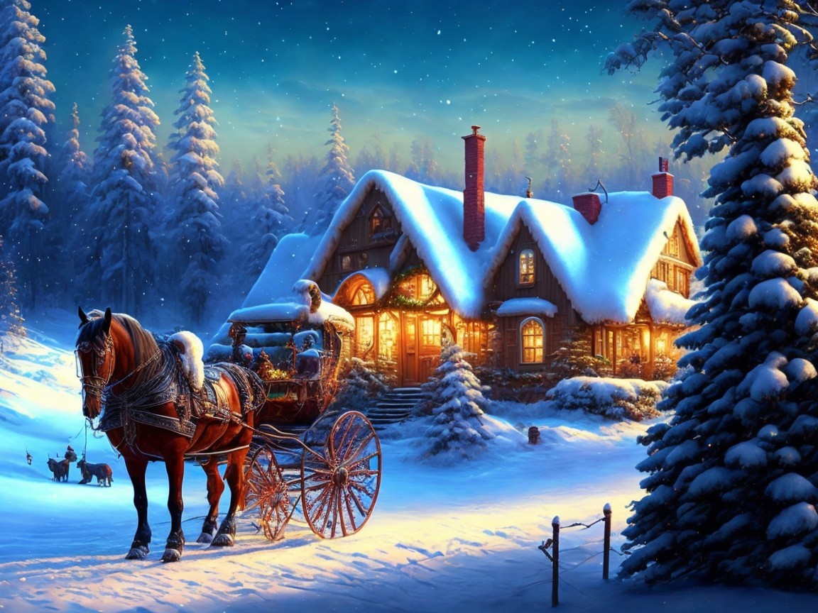 A cozy, snow-covered cabin glows warmly under a starry sky, with a horse-drawn carriage nearby. Tall pine trees surround the scene, creating a serene winter wonderland.