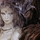 A bride with long, wavy white hair and an intricate headpiece stands solemnly beside a tall, monstrous figure with sharp teeth and glowing blue eyes, set against a moody, candlelit backdrop.