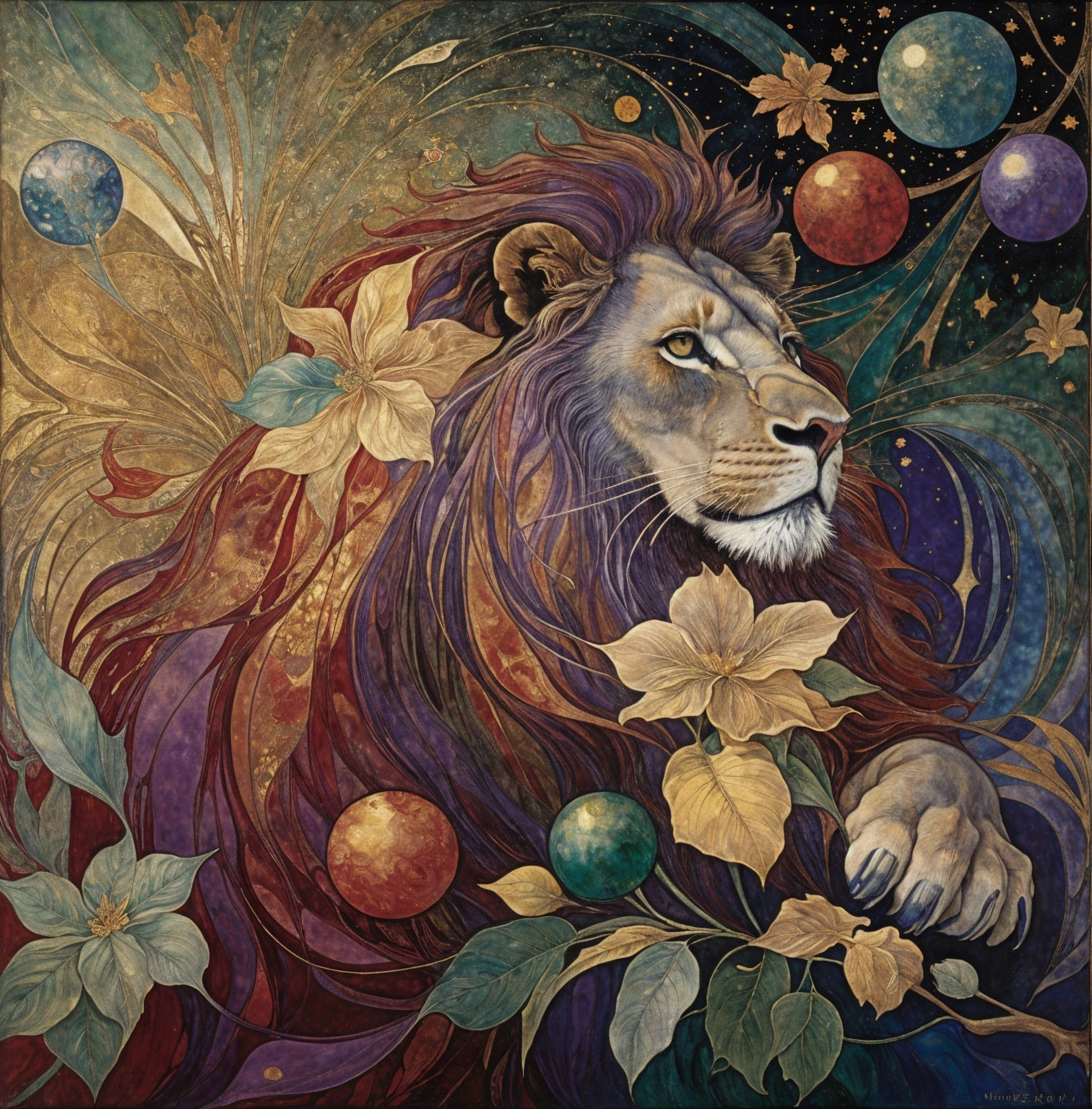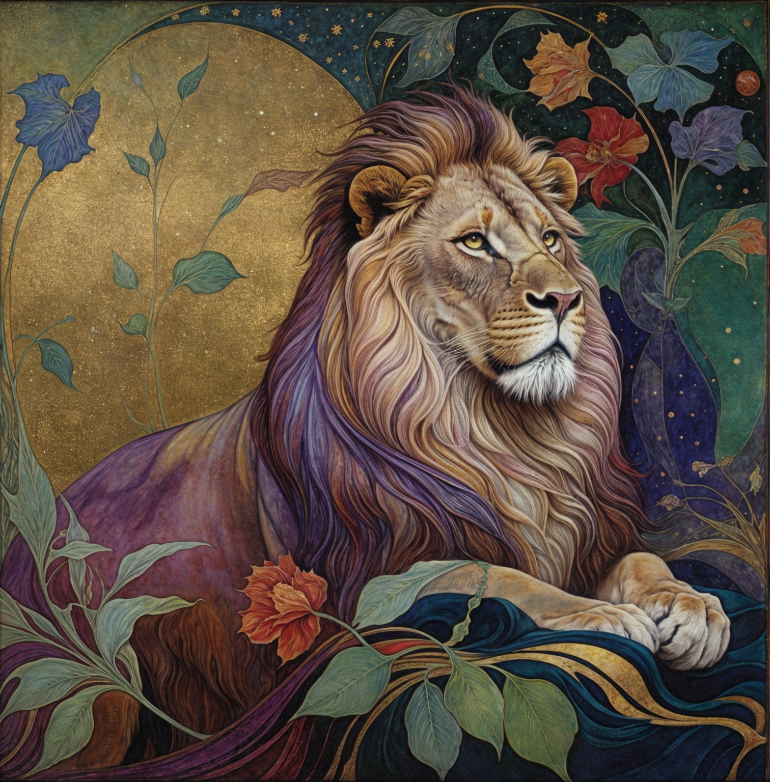 A majestic lion with a flowing, golden mane rests regally on a rocky outcrop, set against a vibrant, abstract background of blues and golds, giving a sense of power and serenity.